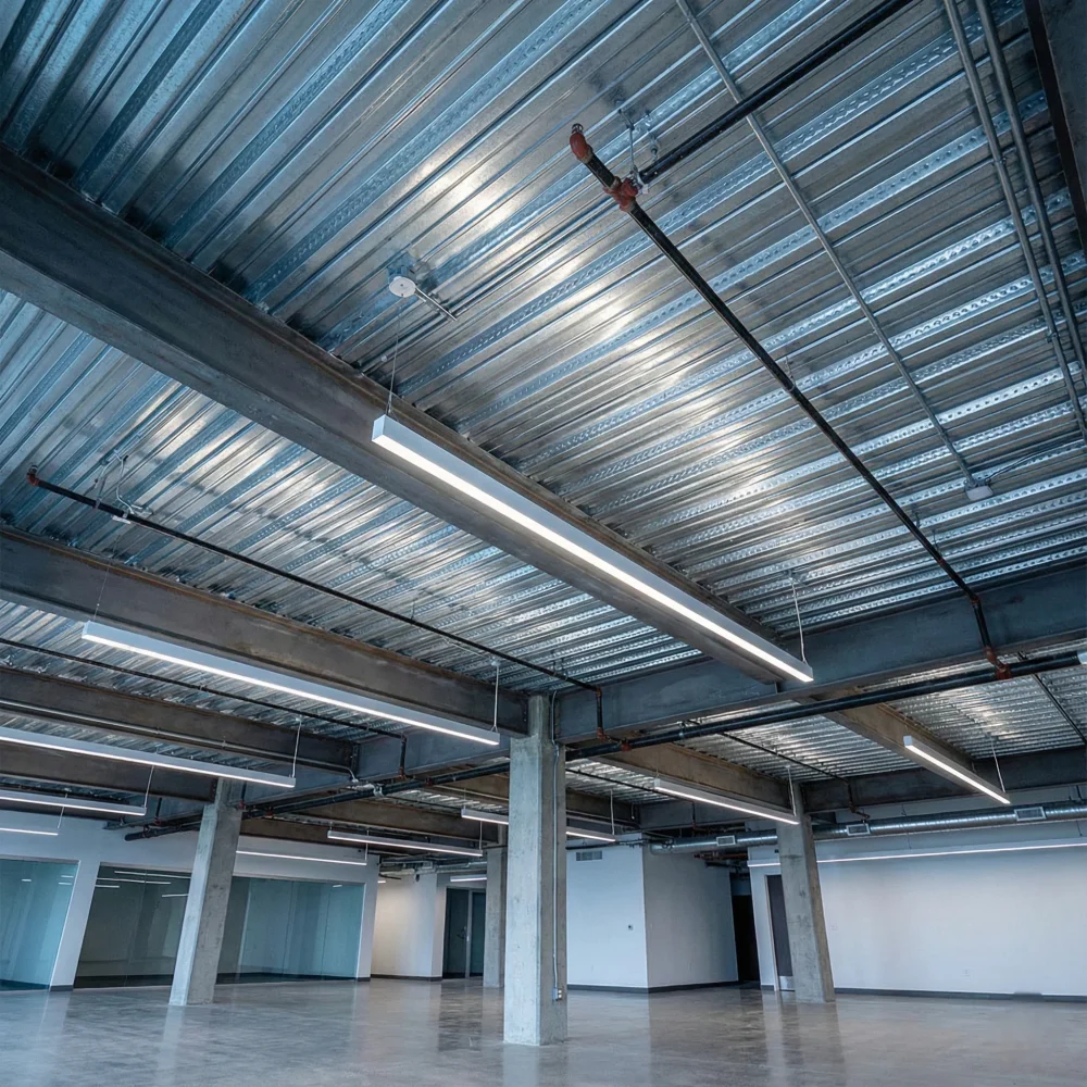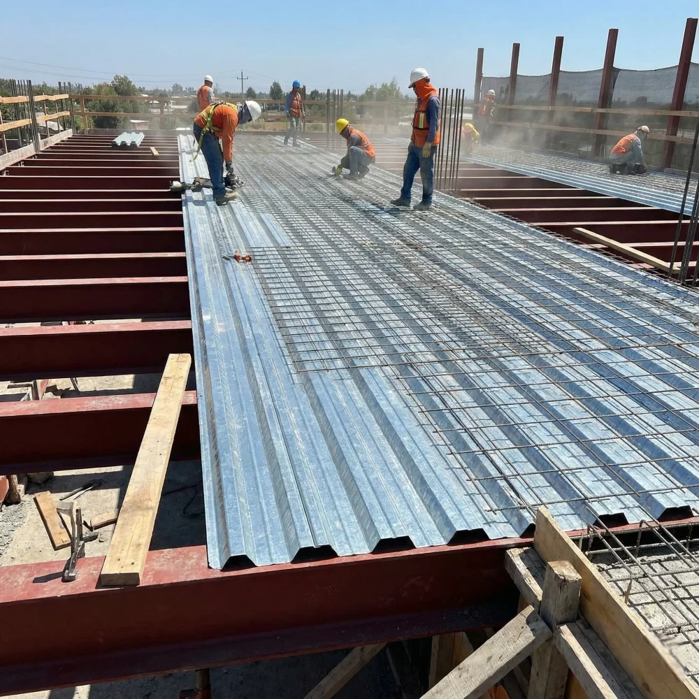 Desde rascacielos corporativos hasta ampliaciones residenciales, la Losacero (Sección 4) es el estándar de la ingeniería moderna. Garantiza losas limpias, sin filtraciones de lechada y con una estética industrial inferior que puede dejarse aparente si se desea.